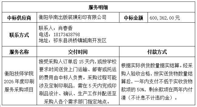 衡阳技师学院2026年度印刷服务采购项目于2026年4月7日结束,现将中标结果公告如下: