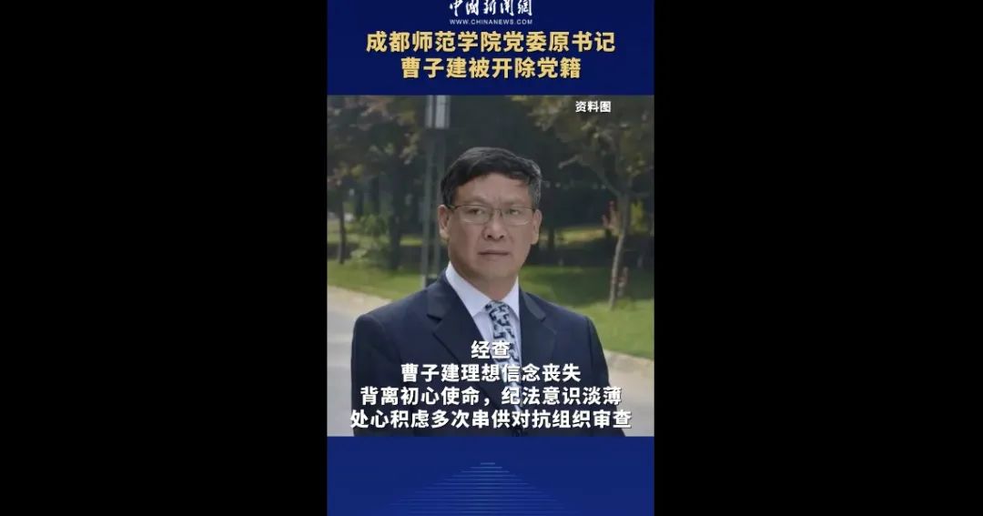 成都师范学院党委原书记曹子建涉嫌严重违纪违法,目前正接受纪律审查和监察调查。
