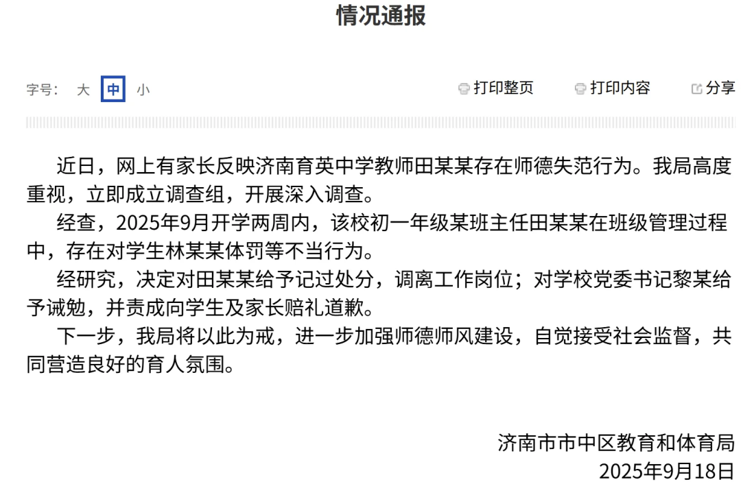 9月18日,山东济南市中区教体局通报育英中学初一年级某班主任田某某体罚学生被处分。经查,9月开学两周内,田某某在班级管理过程中存在对学生林某某体罚等不当行为。学生母亲付女士称,看了孩子入学这两周在校的3个监控片段,孩子被老师罚站、扇耳光。通报称,田某某被记过处分,调离工作岗位;该校党委书记黎某被诫勉。付女士称,已就此事向警方报警,并委托律师将起诉涉事老师,追究相应责任。济南市教育局称,正关注此事。