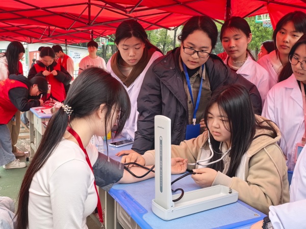 健康义诊区,健康管理专业志愿者为师生测量血压,结合生活习惯讲解防控知识,并给出个性化调理建议。志愿者们以专业知识守护健康,让关怀实实在在温暖人心。