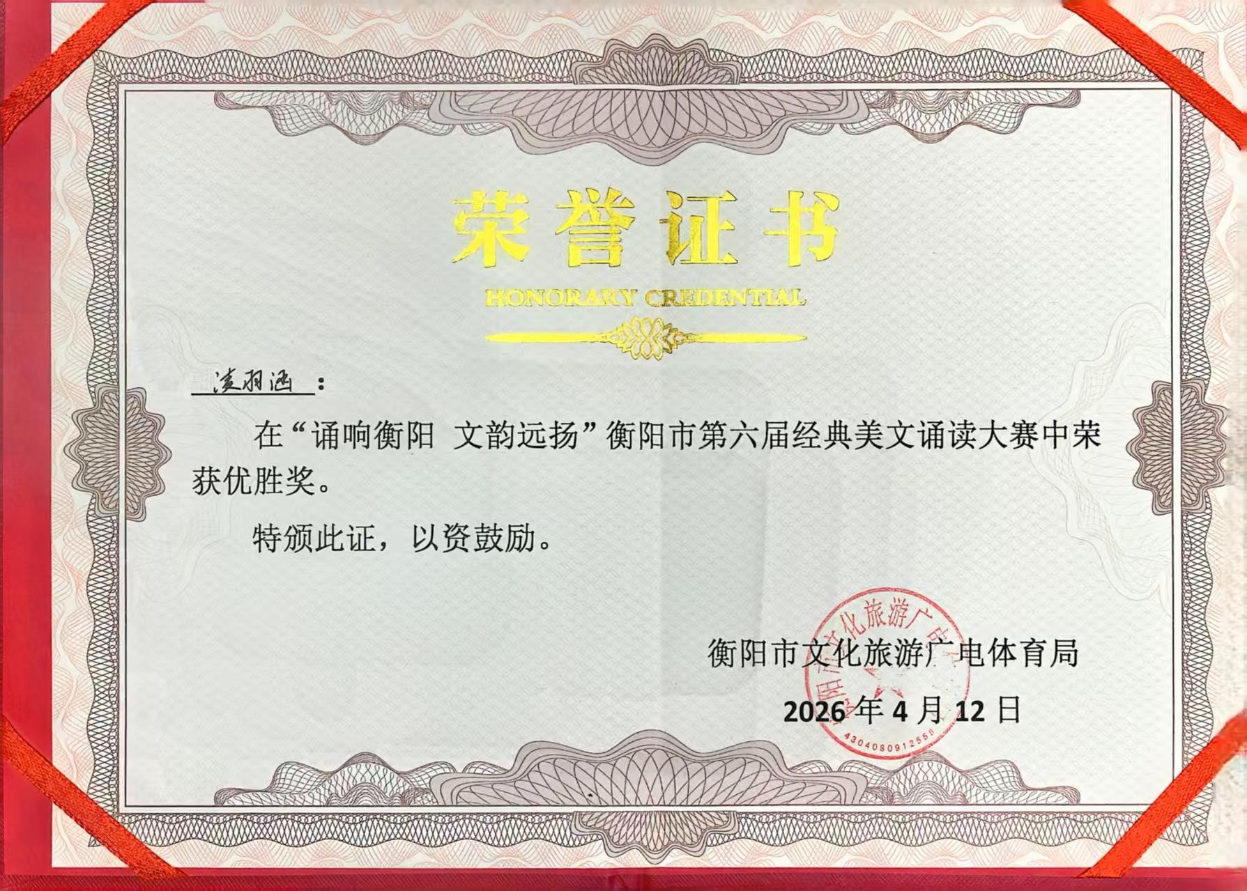 本次比赛由衡阳市文旅广体局主办,参赛选手以衡阳市各校教师、机关单位工作人员为主,整体水平高、竞争激烈。面对实力强劲的对手,凌羽涵同学从容自信、声情并茂,充分展现了扎实的语言功底与良好的精神风貌。