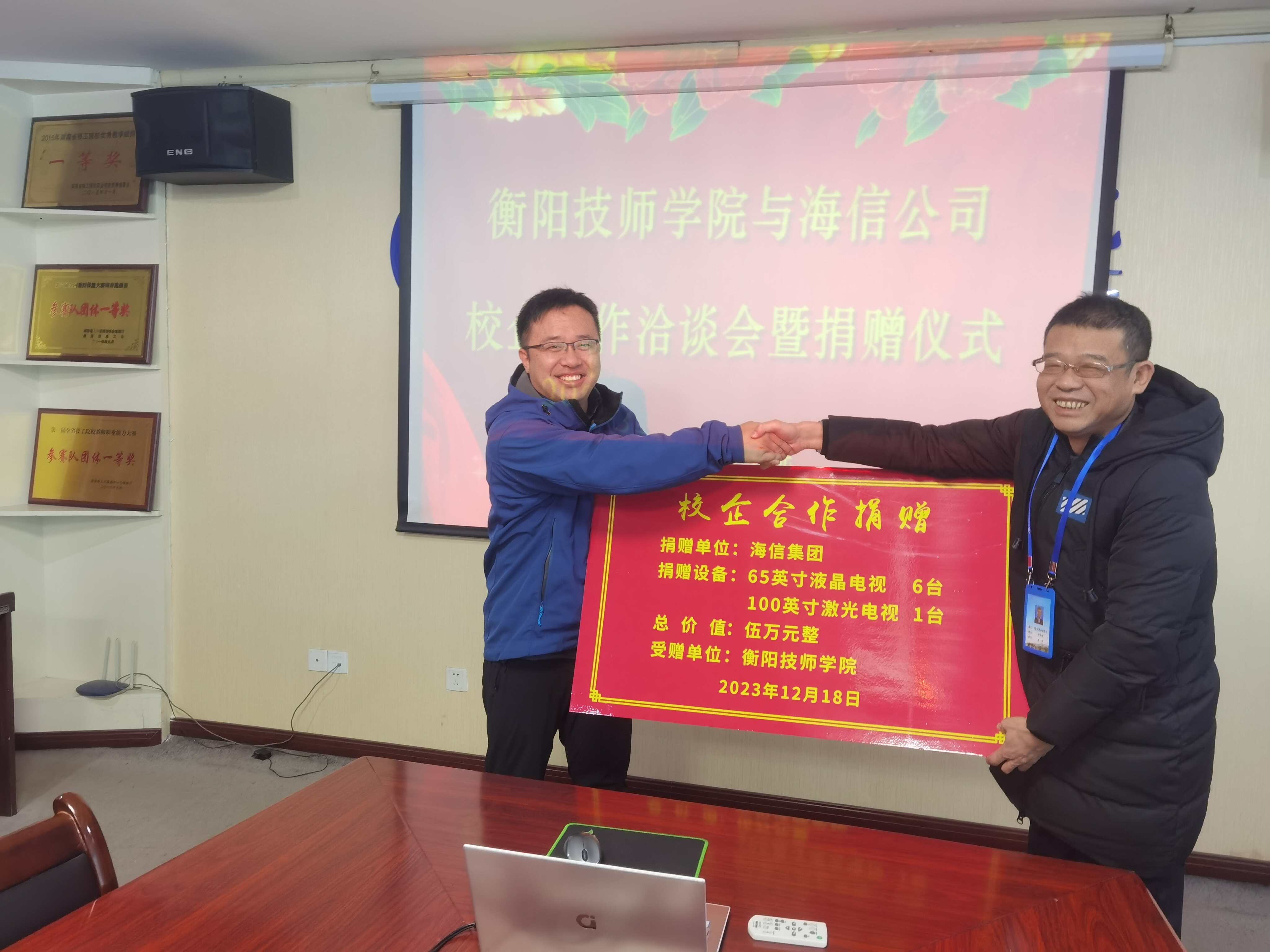 座谈会后,双方还举行了校企合作捐赠仪式,海信公司向学院捐赠6台65英寸液晶电视和1台100英寸激光电视用于改善学院办学条件,总价值五万元。
