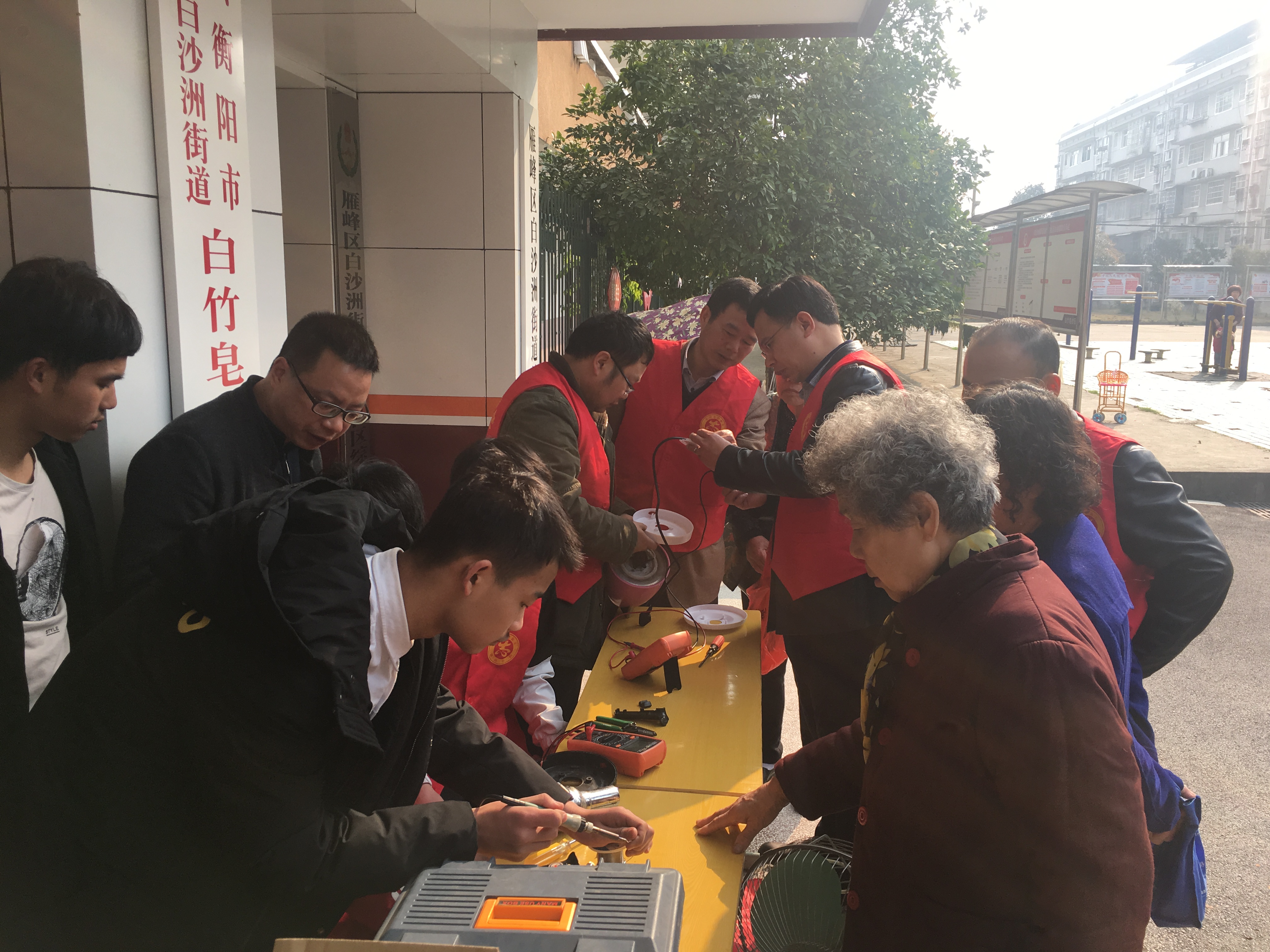 3月12日(植树节)上午9时,电气工程学院与雁峰区白竹皂社区联合开展的“学雷锋志愿者在行动”活动正热火朝天进行中,这边院长尹南宁带领的家电维修志愿者们正帮助居民们解决一个个家电问题,那边党总支书记陈斌带领的志愿者们扛起锄头、举着铲子种下了一棵棵希望之树。社区的妈妈带着宝宝骑着有故障的小单车前来维修,居民个个拍手称赞!