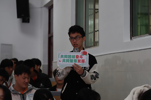 来自新疆的维吾尔族学生阿曼尼沙分享了自己在校学习的故事,并立志回乡成为“数字牧羊人”,用电商带领乡亲们致富的梦想。22电商高技3班学生刘馨从一颗石榴说起,讲述了校园里各民族同学互帮互助、亲如一家的温暖点滴。她们用最真实的声音展现了新时代青年对民族团结的深刻理解和自觉担当,引发了全场师生的共鸣。
