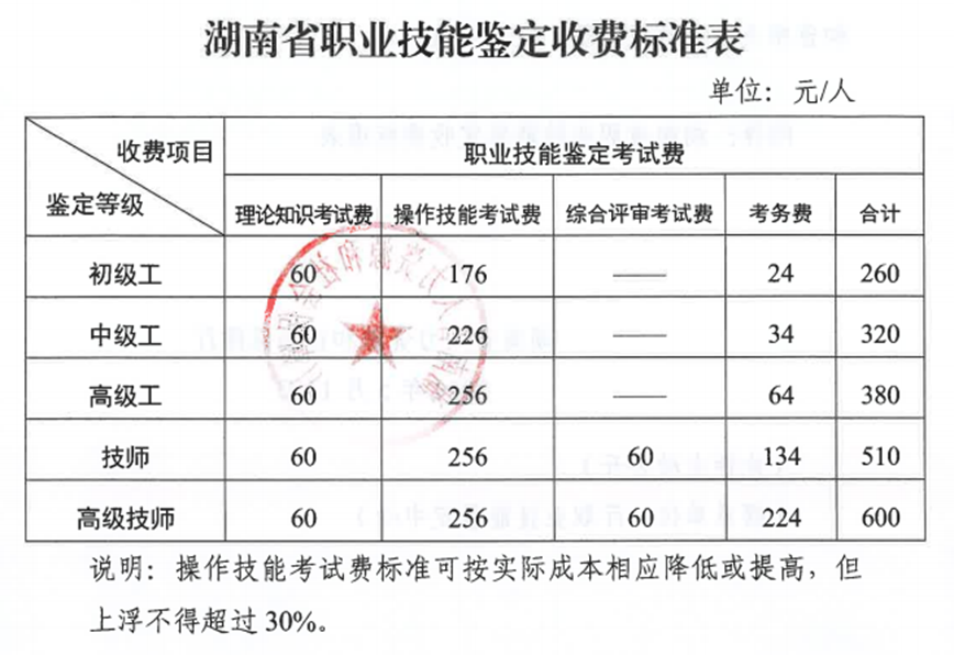 根据(湘人社规[2024] 3号)文件精神,我院职业技能等级认定收费按以下标准收取。