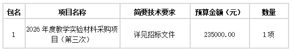 湖南省招标有限责任公司采购代理机构受衡阳技师学院的委托,对2026年度教学实验材料采购项目(第三次)(委托代理编号:0623-2685N1124006 )进行公开招标采购。欢迎符合资格条件的投标人前来投标。