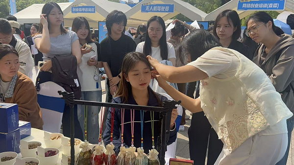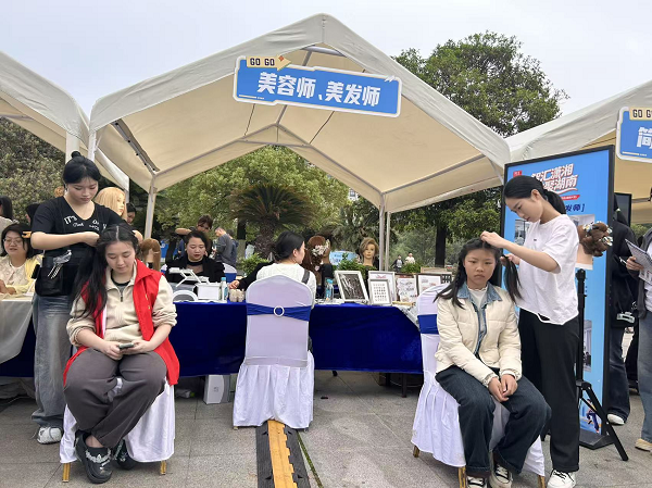 4月18日,“智汇潇湘 才聚湖南”2026年湖南省促进高校毕业生就业创业专场招聘活动(湘南片区)暨“湘才留湘”生物医药卫生专场招聘活动在衡阳举行。衡阳技师学院经贸旅游学院师生在招聘活动养生保健体验区展现技能风采。