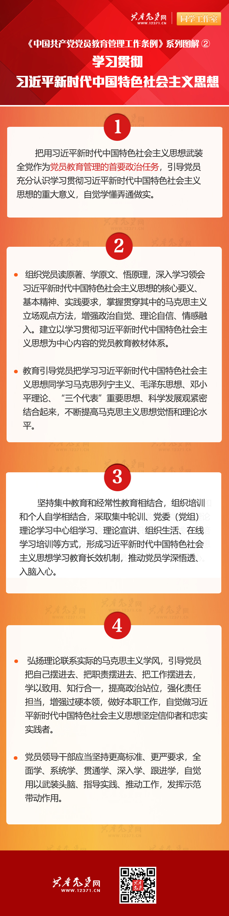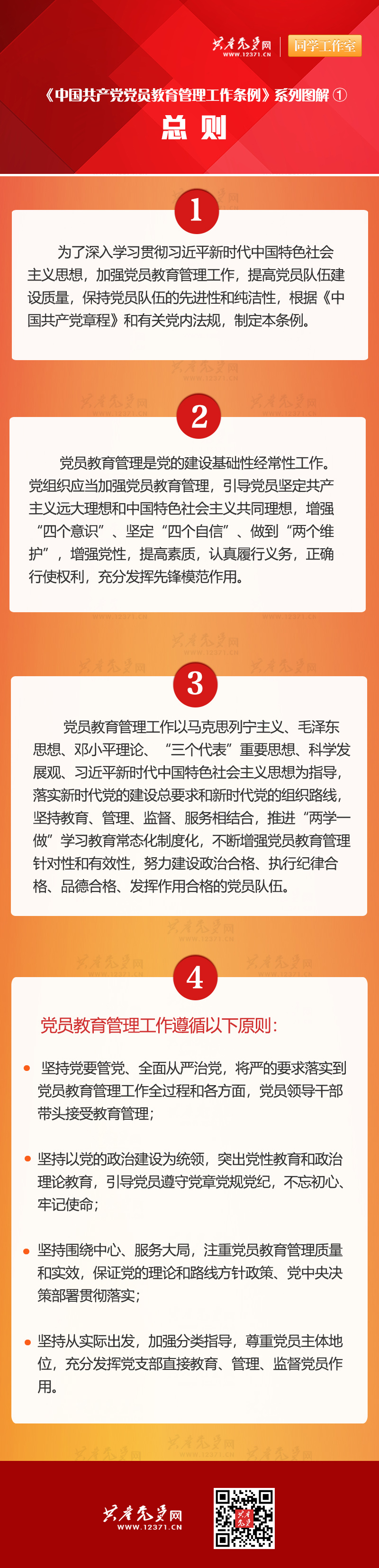 第三条 党员教育管理工作以马克思列宁主义、毛泽东思想、邓小平理论、“三个代表”重要思想、科学发展观、习近平新时代中国特色社会主义思想为指导,落实新时代党的建设总要求和新时代党的组织路线,坚持教育、管理、监督、服务相结合,推进“两学一做”学习教育常态化制度化,不断增强党员教育管理针对性和有效性,努力建设政治合格、执行纪律合格、品德合格、发挥作用合格的党员队伍。
