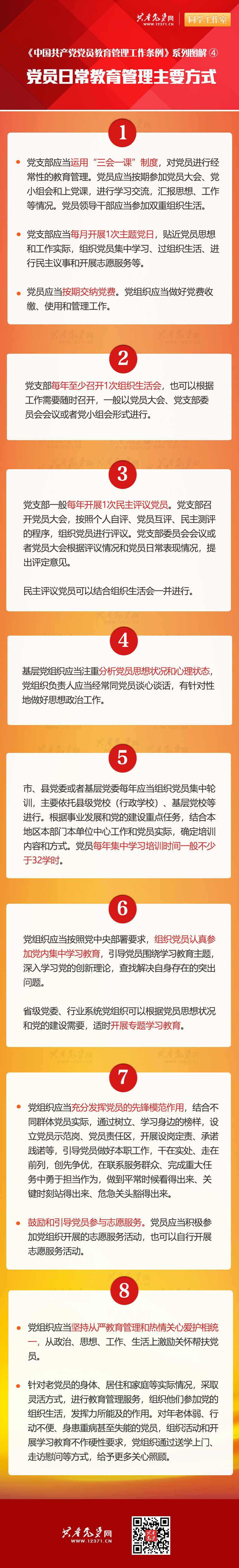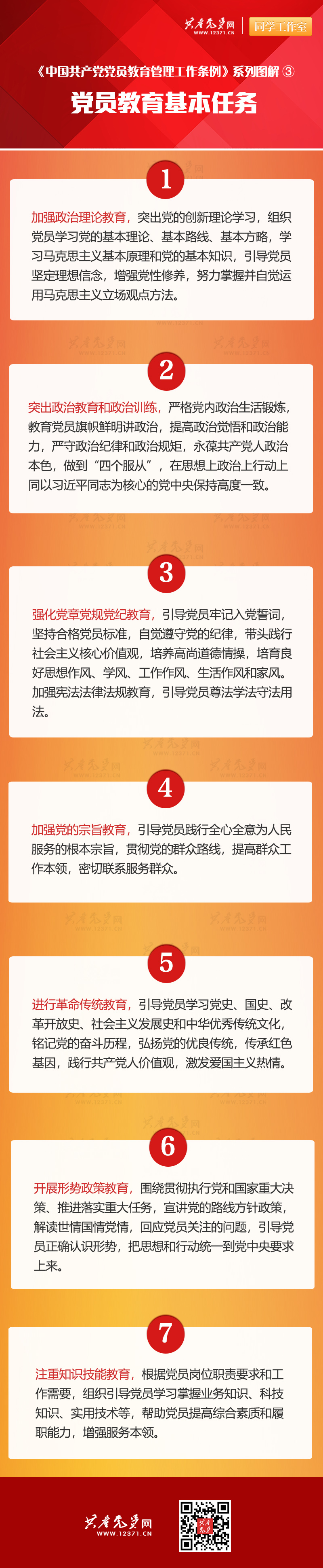 第十一条 强化党章党规党纪教育,引导党员牢记入党誓词,坚持合格党员标准,自觉遵守党的纪律,带头践行社会主义核心价值观,培养高尚道德情操,培育良好思想作风、学风、工作作风、生活作风和家风。加强宪法法律法规教育,引导党员尊法学法守法用法。