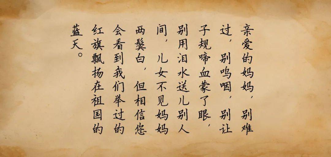 夏明翰在母亲的鼓励和影响下走上了革命的道路,想起慈母的谆谆教诲,夏明翰写道:“亲爱的妈妈,别难过,别呜咽,别让子规血口蒙了眼,别用泪水送儿离人间。儿女不见妈妈两鬓白,但相信你会看到我们举过的红旗飘扬在祖国的蓝天!”担心自己牺牲后母亲因失子之痛而伤心,他恳请母亲“莫用泪水送儿别人间”,要看到前途和光明。