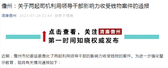 近期,儋州市纪委监委查处了两起利用领导干部的影响力收受钱物的案件。为进一步强化警示教育,现将有关情况通报如下: