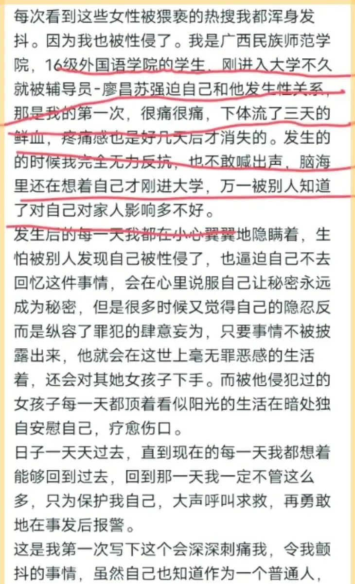 近日,广西民族师范学院16级毕业女大学生(就读于外国语学院)在网络平台上公开指控,在她大一的时候遭受了外国语学院辅导员的性侵 。