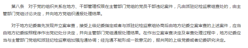 第6条第1款“给予驻在部门的处级及以下党员干部党纪处分,由部门机关党委、机关纪委进行审查和审理,并依据《中国共产党章程》第四十二条规定履行相应程序后,由党组讨论决定。在作出党纪处分决定前,应当征求派驻纪检监察组意见‘;