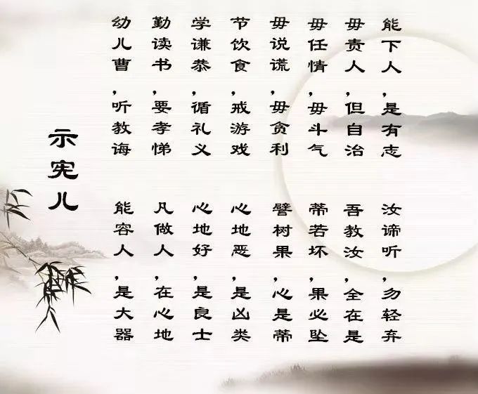 幼儿曹,听教诲: 勤读书,要孝悌; 学谦恭,循礼仪; 节饮食,戒游戏; 毋说谎,毋贪利; 毋任情,毋斗气; 毋责人,但自治。 能下人,是有志; 能容人,是大器。 凡做人,在心地; 心地好,是良士; 心地恶,是凶类。 譬树果,心是蒂; 蒂若坏,果必坠。 吾教汝,全在是。 汝谛听,勿轻弃。 王守仁,即王阳明(1472年10月31日—1529年1月9日),幼名云,字伯安,别号阳明。因曾筑室于会稽山阳明洞,自号阳明子,学者称之为阳明先生,亦称王阳明。 王阳明,明代著名的思想家,是心学的集大成者,与孔子(儒学创始人)、孟子(儒学集大成者)、朱熹(理学集大成者)并称为孔、孟、朱、王。 他是中国历史上唯一一个没有争议的立德、立功、立言三不朽的圣人。曾国藩曾这样评价他:"王阳明矫正旧风气,开出新风气,功不在禹下"。 知识拓宽格局,格局成就人生。 读书,是获取知识,打破门第之见最廉价的捷径。 羊羔跪乳,乌鸦反哺,孝顺父母,是做人的天性良知。 从小教育孩子认真读书,孝敬父母,这是王阳明家训中的头等大事。 有一种修养,叫“勿以身贵而贱人”。 教会孩子不因为自己的出身而仗势凌人,就是帮助孩子树立正确的价值观。 有的人就算成年了,还是言语任性,目中无人,人缘奇差。 有的人还没有走上社会,就已经学会了礼貌待人,身边总是不缺贵人。 不抬高自己,亦不贬低别人,尊重别人才能得到别人的尊重。 “饮食有节”,是古人基本的生活态度。 生活在一个更容易发胖、患富贵病的时代,连身体都控制不了,如何掌控自己的人生? 玩乐是孩子的天性,但绝不可过分沉溺游戏。 玩物,必然丧志。不立志,何谈将来立德、立功、立言? 古训有言:“诚信为本”,诚信,就是做人的根本,是道德的基础。 孔子也曾说过:“人而无信,不知其可也”。 一个连基本的诚信都不讲的人,人生自然难有建树。 贪,看似得,实则失;得了当下,失了未来。 百年老店瑞福祥,在一次大火中烧毁了所有的账本,掌门人决定:凡瑞福祥欠的帐一律奉还,凡欠瑞福祥的帐一笔勾销。这便是“小商求利,大商谋道”。 《增广贤文》中写道:“心似平原走马,易放难追”。 任性放纵,不知道约束和管理自己的性格,这是非常危险的。 任何时候,人都不应该做自己情绪的奴隶。 学会控制负面情绪,就已经离成功更近一步。 毋责人,但自治 这条家训的意义在于:严于律己、宽于待人。 这很难做到,但正因为难,才成为中今中外,由普通走向杰出的一道天堑。 杨震拒收贿赂的故事被世人熟知:面对行贿者“不会有人知道”的论调,杨震义正言辞的回复:“天知地知你知我知,怎么会没有人知道呢?” 让孩子懂得,越自律,越自由。自律,是爱自己的最好方式。 越王勾践卧薪尝胆,光复大业;韩信胯下之辱,十年磨剑,终遇明主。 因此王阳明说:“只要立志真切,就能克治私欲”。 一个目光远大,有志气的人,总是能屈能伸,既能勇往直前,又懂得韬光养晦,能屈能伸,能下人。 王阳明认为,多赞赏孩子,孩子的内心富足,他们就会自信,心态平和,才能看到别人的优点,虚心提升自己。 古训有言:“海纳百川,有容乃大。壁立千仞,无欲则刚。” 一个人的心胸有多宽广,舞台就有多大。 孔子曾经说过:“君子周而不比,小人比而不周”。 真正优秀的人,不仅能正视自己的才能,还悦纳自己的不完美。 真正优秀的人,要能容得下别人。别人弱势,不轻视;别人成功,不眼红。 王阳明说:“凡做人,在心地;心地好,是良士;心地恶,是凶类。譬树果,心是蒂;蒂若坏,果必坠”。 王阳明曾被锦衣卫追杀,在农场,更是遭受了乡民的偏见和攻击。 可是他选择了善良,教会当地乡民读书,耕种,帮助他们治病,建房子。 很快,王阳明就从一个不可信任的外乡人,变成了乡民口中的大善人,活菩萨。 古语云:“道德传家,十代以上,耕读传家次之,诗书传家又次之,富贵传家,不过三代。” 让儿孙做个好人,才是家庭延续兴旺的根本。