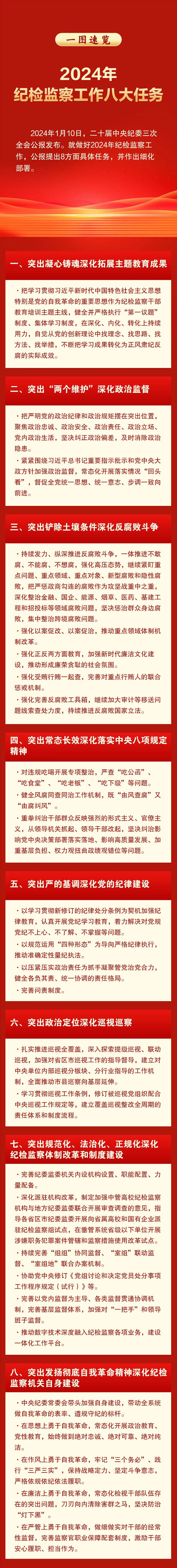全会提出,2024年是中华人民共和国成立75周年,是实现“十四五”规划目标任务的关键一年。做好今年纪检监察工作,要坚持以习近平新时代中国特色社会主义思想为指导,全面贯彻落实党的二十大和二十届二中全会精神,深入学习贯彻习近平总书记关于党的自我革命的重要思想,坚决落实全面从严治党战略方针,深刻领悟“两个确立”的决定性意义,自觉增强“四个意识”、坚定“四个自信”、做到“两个维护”,坚持稳中求进工作总基调,巩固拓展主题教育和教育整顿成果,忠诚履行党章和宪法赋予的职责,推动健全全面从严治党体系,纵深推进正风肃纪反腐,纵深推进新征程纪检监察工作高质量发展,为全面推进中国式现代化提供坚强保障。