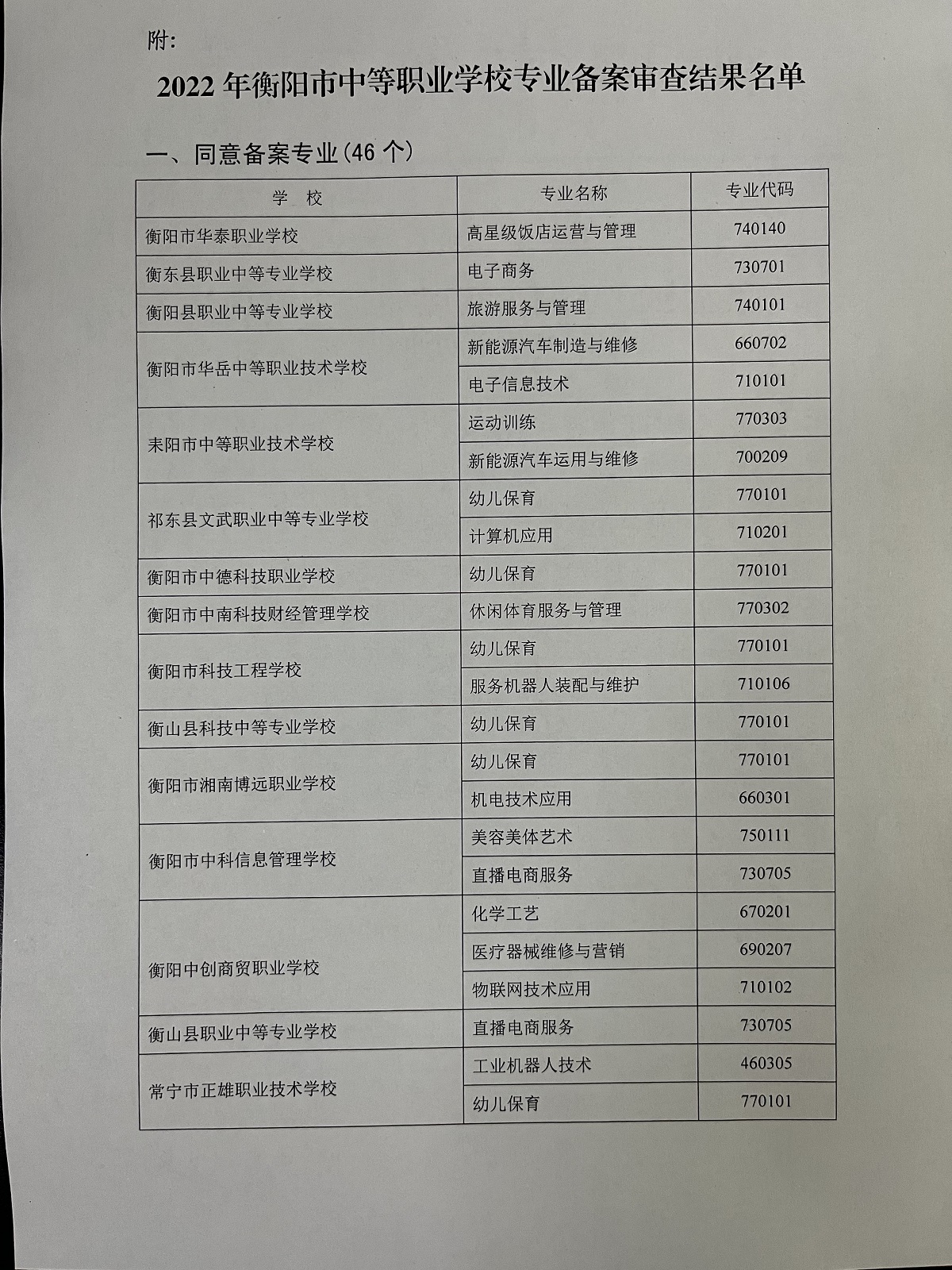 关于公布2022年衡阳市中等职业学校专业备案审查结果的通知