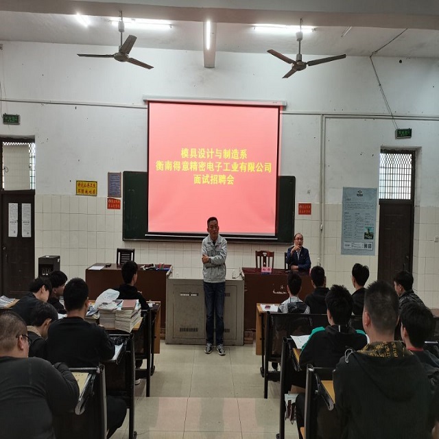 2022年6月28日上午9:00分,衡南得意精密电子工业有限公司来衡阳技师学院模具设计与制造系进行招聘宣讲,参加此次招聘宣讲的有衡南得意精密电子工业有限公司的管理课课长向华、人事部助理周琴琴、模具系学管副主任李双文、模具系2018级高级技工班学生。向华课长以三篇有趣的寓言故事开场,详细的介绍了衡南得意公司的企业文化和企业信息,诙谐但又严谨的言语让就业学生感到轻松活跃,同时也发人深省,为就业学生指明了就业方向。