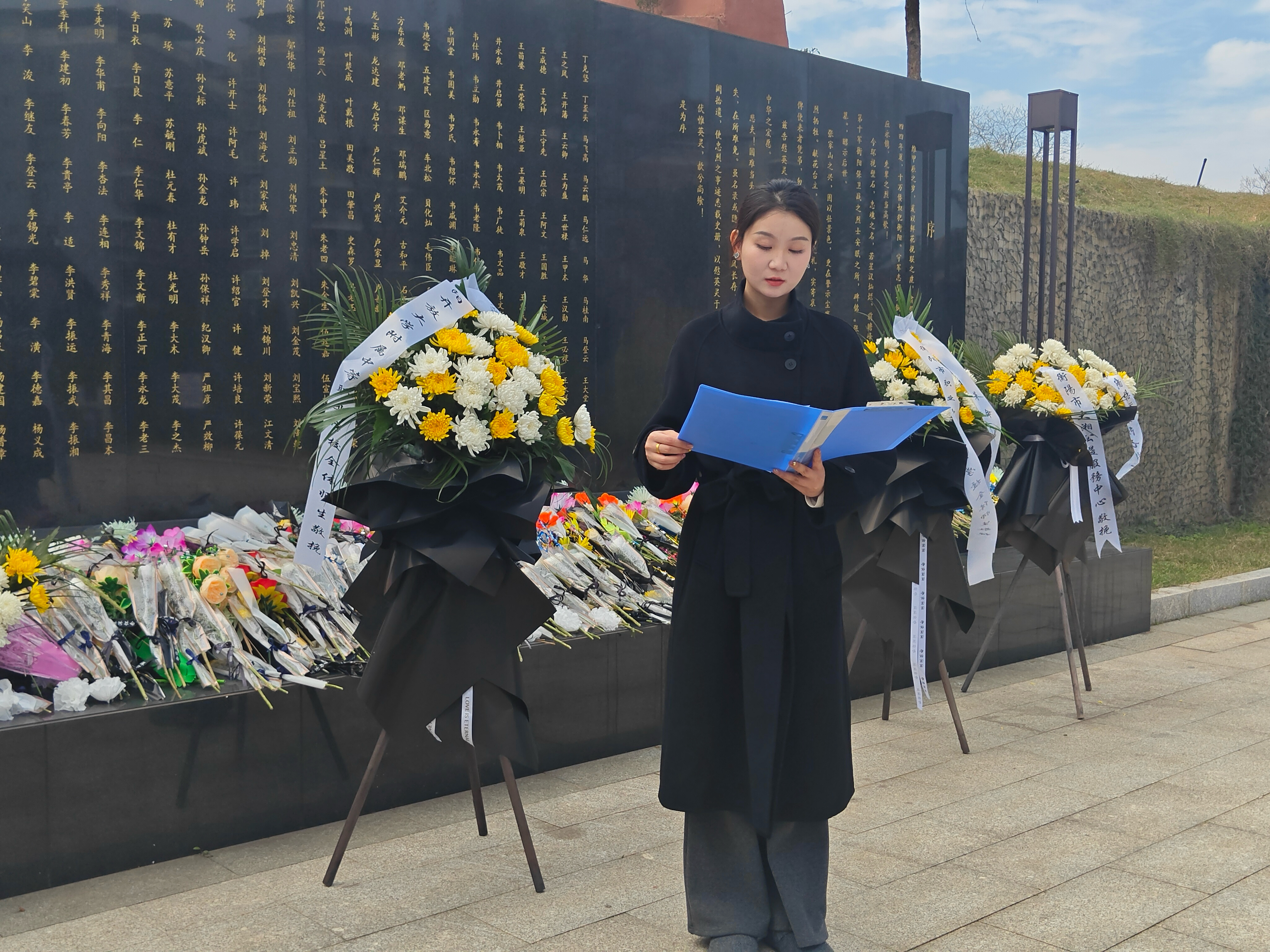 在张家山抗战遗址烈士名录纪念碑前,全体师生整齐列队,神情凝重。祭奠仪式以三鞠躬礼开场,师生集体默哀一分钟,深切悼念革命先烈。随后,马克思主义学院思政教师陈运敏深情讲述张家山抗战英烈的英勇事迹,带领师生重温烽火岁月,感悟革命精神的不朽力量。敬献鲜花环节中,师生缓步走向纪念碑,将鲜花轻轻摆放,寄托追思。