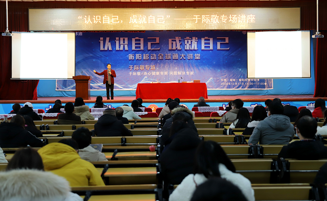 本网讯 12月17日下午,学院在大礼堂举办“全球通大讲堂”,特邀身心健康专家、问题解决专家于际敬开展“认识自己,成就自己”专题讲座。党委书记何东球主持讲座,院长邱家才、党委班子成员、各部门负责人、党总支书记及400余名师生代表一起聆听讲座。