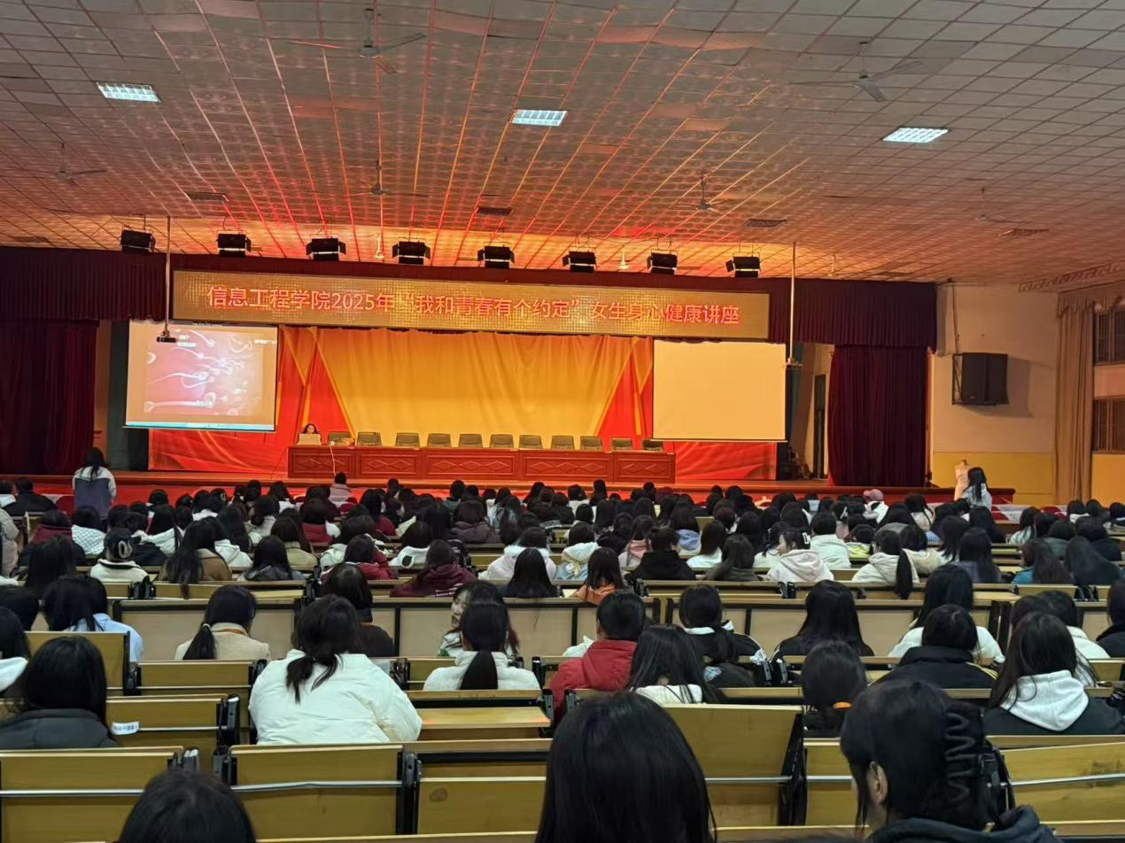 为引导女生更好的认识自我、关爱自我,2025年3月31日19:00,信息工程学院于大礼堂举办了“我和青春有个约定”女生身心健康专题讲座。全院30个在校班级共597名女生参加,参加本次讲座的还有我院学管副院长封山河,学生处副处长胡永华、学生处李玉老师。此次讲座旨在帮助女生们加强自我保护意识,树立正确的异性观,建立积极的自我形象。讲座由学院团总支书记、国家三级心理咨询师王欢老师主讲。