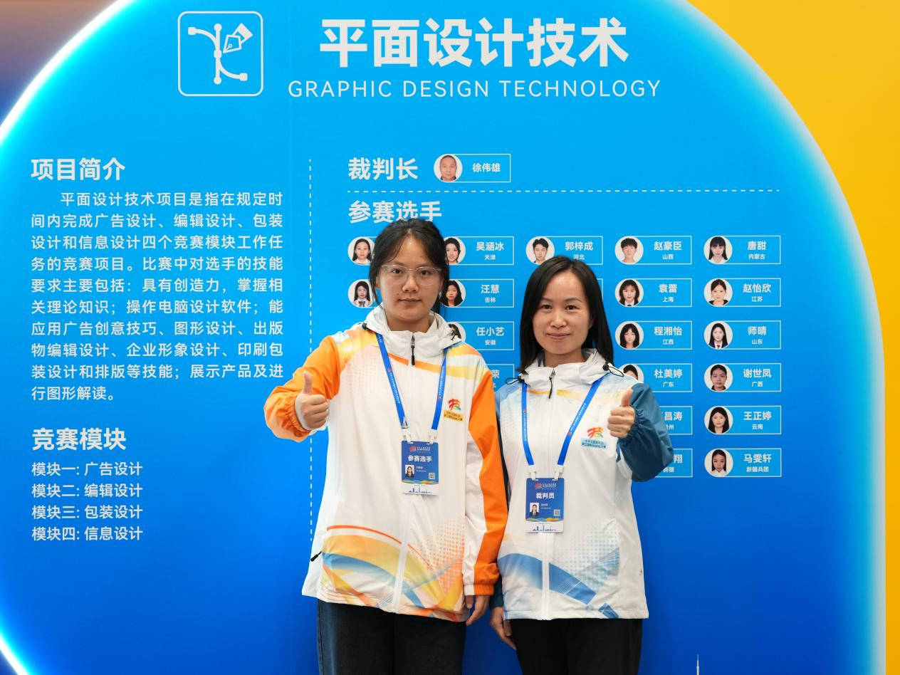 此次国赛之旅始于2025年4月。在湖南省第二届职业技能大赛中,刘嘉惠同学于平面设计技术项目中表现出色,凭借优异的成绩和稳定的发挥入选湖南省集训队,赢得了代表湖南省出征第三届中华人民共和国职业技能大赛的宝贵资格。在国赛舞台上,刘嘉惠在指导老师贺玲丽的陪伴下沉着应战,面对更高难度的挑战与更强大的对手,她不仅展现出日益纯熟的技术水平,更保持了极为稳定的心态,实现了技术能力与心理素质的同步提升。