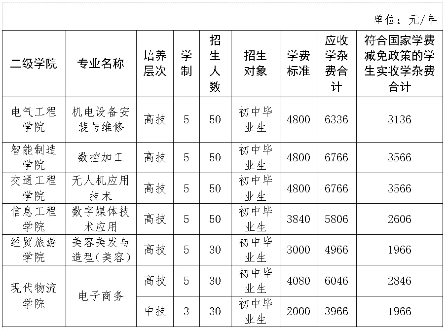 1.报读中技层次且符合国家学费减免政策的学生免交学费,报读高技层次且符合国家学费减免政策的学生在此标准上减免学费1600元/期后按差额交学杂费;